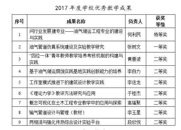 何利民教授主持《问行业发展建专业——油气储运工程专业的建设与实践》获2017年中国石油教育学会高等教育教学成果奖特等奖和学校教学成果特等奖,其他8项成果获得一、二等奖。
