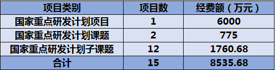 2019-2023年,学院签订国家重点研发计划项目课题等合同共计15项,经费额共计8535.68万元。 其中,2021年获批1项国家重点研发计划项目,批准经费6000万元。