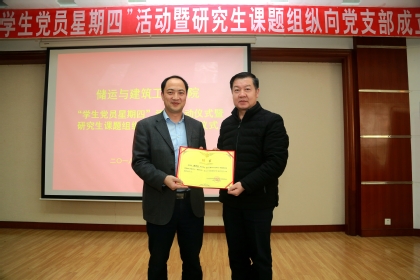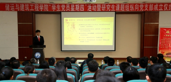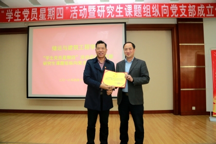 会议以奏唱国歌、重温入党誓词开始,接着由储建学院党委副书记张程开始宣读《关于组织开展“学生党员星期四”主题活动的通知》、《关于在研究生课题组成立纵向党支部的决定》等文件,由储建学院党委书记高平为“党支部联系人”代表李玉星、俞然刚等颁发证书。之后由已取得优异成绩的“星晖”研究生党支部书记宋存永介绍经验。宋存永首先从党支部成员、工作思路、工作安排等几个方面介绍了星晖党支部的基本情况,又以三会一课六制度为例详细阐述了星晖党支部的制度建设,从实践方面讲述了党支部的经验启示以及工作展望。