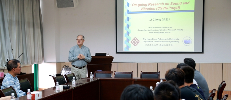 成利教授的学术报告主要介绍了香港理工大学在声学与振动及其应用等方面开展的研究及取得的各项成果。内容共分为:流声固耦合机理、振动与冲击、噪声控制、超声检测、小波变换、声学黑洞、结构健康诊断七个方面。成教授从工程需求出发,以理论研究为基础,深入浅出的为在座的师生详实、踏实、风趣的讲解了各个研究内容的出发点、目的、以及实现手段,使的整场讲座生动活泼且富有趣味。