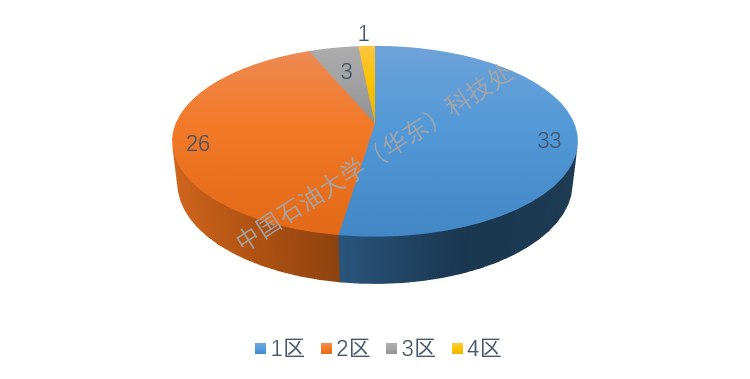 图5 我校作为第一署名单位或通讯作者单位入选ESI高影响论文的ESI学科分布 4 我校作为第一署名单位或通讯作者单位入选的ESI高影响论文的期刊分布情况 4.1 我校作为第一署名单位或通讯作者单位入选ESI高影响论文的中科院期刊分区分布 我校作为第一署名单位或通讯作者单位入选的65篇ESI高影响论文中,33篇分布在中科院期刊分区1区,26篇分布在2区,3篇论文分布在3区,1篇论文分布在4区。此外,2篇论文为SSCI收录,无中科院期刊分区数据。