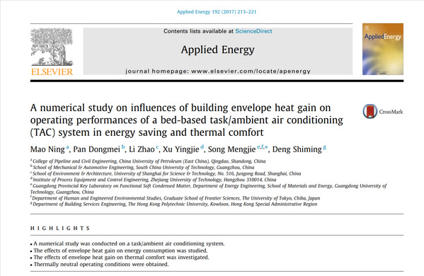 A NUMERICAL STUDY ON INFLUENCES OF BUILDING ENVELOPE HEAT GAIN ON OPERATING PERFORMANCES OF A BED-BASED TASK/AMBIENT AIR CONDITIONING (TAC) SYSTEM IN ENERGY SAVING AND THERMAL COMFORT | 毛宁 | 宋孟杰 | APPLIED ENERGY | 13 | 2017 | 高被引论文 |