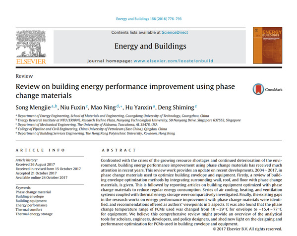 REVIEW ON BUILDING ENERGY PERFORMANCE IMPROVEMENT USING PHASE CHANGE MATERIALS | 宋孟杰 | 毛宁 | ENERGY AND BUILDINGS | 6 | 2018 | 高被引论文 |