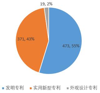 一、专利 我校2018年1-10月份共授权职务专利863件,10月新增100件。其中,发明专利473件,实用新型专利371件,外观设计专利19件(图1),10月新增发明专利49件、实用新型专利51件。 图1 我校2018年1-10月授权职务专利类型分布图 各单位授权发明专利数如图2所示。
