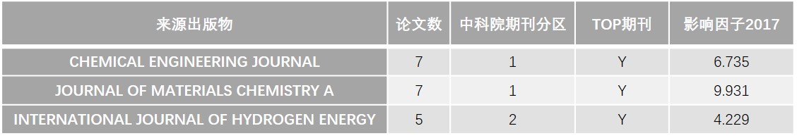 我校作为第一署名单位或通讯作者单位ESI高影响论文发文量前3的来源出版物分别是《CHEMICAL ENGINEERING JOURNAL》、《JOURNAL OF MATERIALS CHEMISTRY A》、《INTERNATIONAL JOURNAL OF HYDROGEN ENERGY》,其他期刊的发文量均在2篇以下。