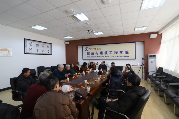 1月16日下午,东营天气为零下6度,弘毅楼102会议室内退休老教师们心里面却非常热乎。高平发书记、于桂杰主席、黄善波副院长、唐建峰副院长关切地询问着老师们退休后的生活和身体状况,力学系主任刘建林、土木党支部书记黄思凝也给老师们转达了系里的慰问牵挂。高平发书记向退休教师们通报了学院2018年度取得的新进展和取得的成绩,并对退休教师们学院一如既往的关心表达了诚挚的敬意与感谢。赵振远老师动情地说道:“虽然现在东营黄岛两地相隔,可是时常感受到学院的关怀。我们退休教师尽管不在一线工作,但和学院的情分没有断,我们都在默默关心着学院发展。有需要的时候喊一声,我们都是储建人!”
