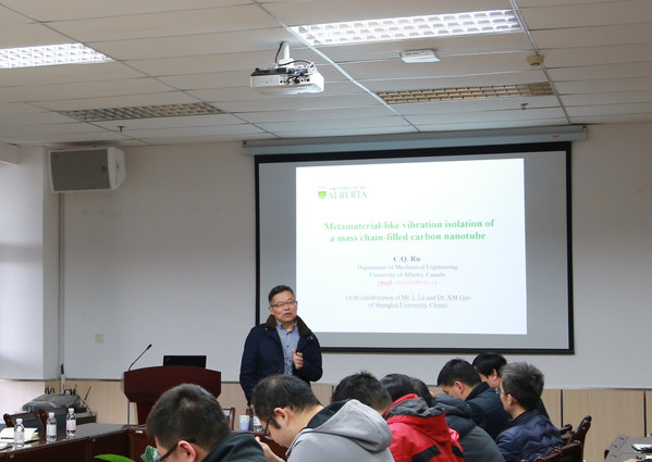 在国际交流合作基金项目“2019阿尔伯塔大学先进理工技术进展研讨会”和学院“储建论坛”资助下,加拿大阿尔伯塔大学茹重庆教授应邀于2019年3月19日至3月22日到我校访问交流,并于3月20日做了题为“Metamaterial-like Vibration Isolation of Mass Chain-filled Carbon Nanotubes”的学术报告。报告详细介绍了茹重庆教授在碳纳米管、超材料隔振领域的研究成果和最新进展。报告内容丰富、精彩生动,对我校相关科研工作具有借鉴作用。同时,茹教授还结合自己多年的研究经历,与现场听众分享了在固体力学领域的研究心得和体会。