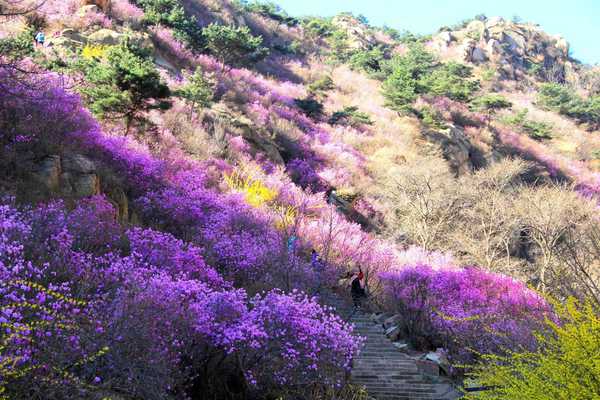始入大珠山,便感受到与平日生活中不一样的景致。最先映入眼帘的是开阔的湖光山色,远处层峦巍峨起伏,遥映在粼粼湖水。沿着湖边的步道上行,清新的空气直抒胸臆。清明节还未到,但珠山秀谷的花儿已经开得甚好。山坡上遍是杜鹃,随着风的吹动,摇曳成一片粉紫色的花海。其间点映着鹅黄的迎春,明快活泼。向上的山道被花丛包围,珠山秀谷仿若温柔的少女,无需言语,便告知了春的消息。老师们纷纷在此停留赞叹,摄影高手们也不能错过这个场景,“快来快来,我帮你们拍一张!”“这个姿势好,微笑看镜头哦!”大家聊着、笑着、闹着,一起向山顶前行。