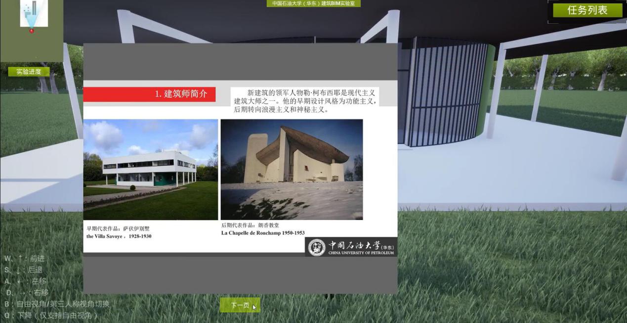 《建筑解析与空间体验虚拟仿真实验》于2019年9月申报并被山东省教育厅推荐参评国家级虚拟仿真实验项目,主要通过构建的三维虚拟仿真建筑,使学生在场景中对优秀建筑进行观察、对比、剖切、空间体验,研究建筑空间相互关系及特点。对提高空间思维能力、识图绘图教学效率和改善教学效果起到了重要作用,学生可以通过手机、电脑等终端设备身临其境完成规定的教学任务,在线形成实验报告,教师远程批改作业。