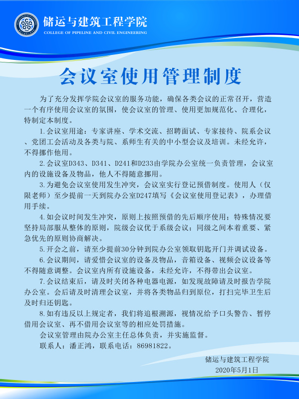 2.会议室D343、D341、D241和D233由学院办公室统一负责管理,会议室内的设施设备及物品,他人不得随意挪用。