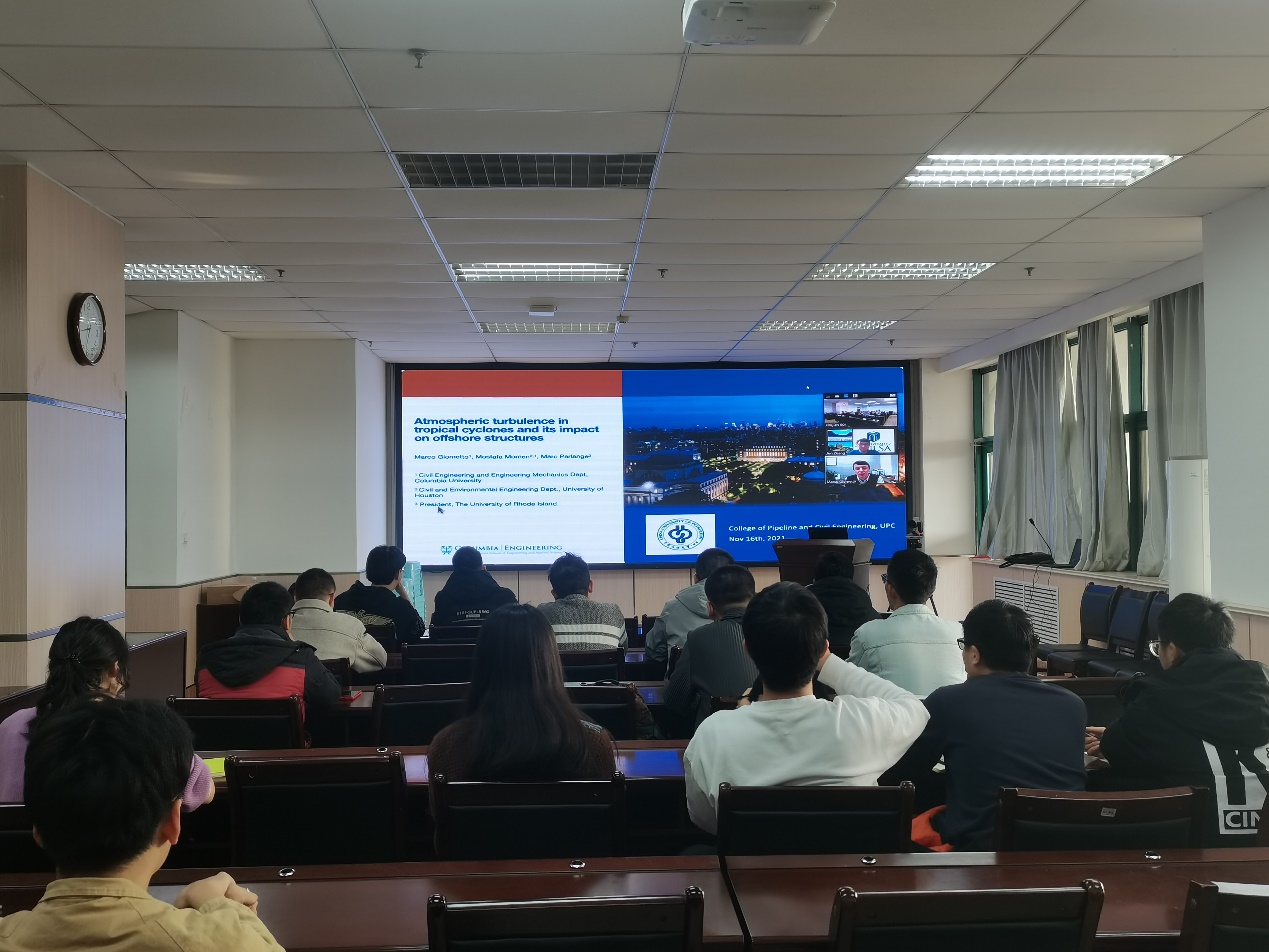 2021年11月17日,在科技部外国专家项目“油气储运学科创新引智(培育)基地”支持下,美国哥伦比亚大学环境流物理实验室主任Marco Giowanni Giometto助理教授受我院邀请,在线做题为“热带气旋中大气湍流对海上设施的影响”云端学术报告,报告会由刘翠伟副教授主持,学院师生听取报告并与Giometto教授就相关问题展开交流。