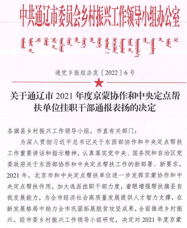 近日,中共通辽市委印发《关于通辽市2021年度京蒙协作和中央定点帮扶单位挂职干部通报表扬的决定》,并专门致函学校,对我校定点帮扶挂职干部尤廷秀、周辉2名同志在当地的优秀表现进行通报表扬。