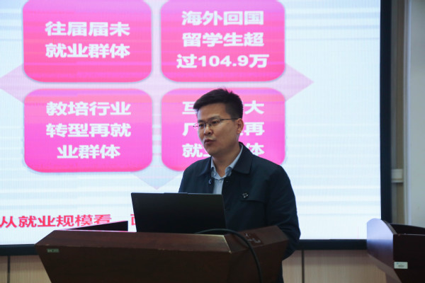 会上,陈文军介绍了当前大学生就业形势。陈文军指出,随着毕业生规模不断增加,就业压力持续增大,后疫情时代大学生就业的求稳心态更加突出,存在“慢就业”“躺平”等现象有增加的趋势,同时,毕业生从生存型就业转向优质型就业,对就业环境提出了更高的要求。陈文军强调,大学生要拓展视野,提高站位,永葆家国情怀,对自己的就业选择及个人发展提前做好规划。学校和学院层面要进一步强化招生、培养、就业各环节联动,要在学生培养的全过程中渗透成才观教育,要通过“课程思政”等渠道着力解决就业择业观的问题。