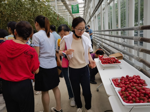 在学院工会主席冷青峰的带领下,学院30余名教职工携带孩子一起来到位于黄岛区张家楼镇的青岛绿色硅谷科技园,了解了科技园内以西红柿有机种植为代表的新技术,在享受采摘西红柿的乐趣的同时,还了解了当地结合国家“一带一路”和蔬菜产业“走出去”战略,着力打造种业研发、种质资源保护、工厂化育苗、高端蔬菜种植、商品化处理、高端品牌营销于一体的设施蔬菜全产业链基地的发展规划。学院一行还参观了绿泽美术馆,教职员工与孩子们一起欣赏着惟妙惟肖的油画艺术作品,感受了当地的文化艺术氛围,陶冶了情操。在青岛紫斐农业科技发展有限公司,学院一行还了解了蓝莓果产业深加工技术和相应的产品。