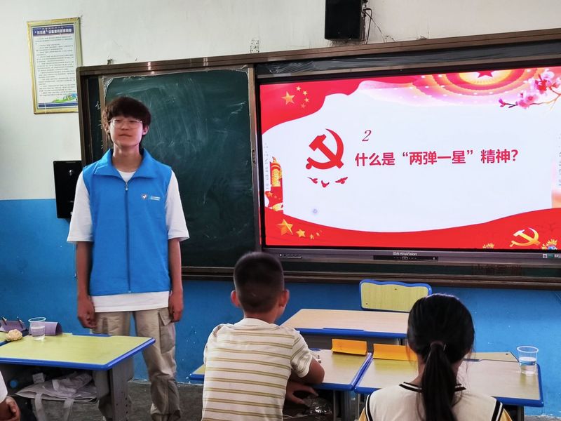 8月10日,王辰熙在学校五、六年级展开主题为“两弹一星精神”的宣讲。在第一节课中,王辰熙向同学们介绍了“什么是‘两弹一星’”和“什么是‘两弹一星’精神”,给同学们进行基本知识的科普。在讲到“两弹一星”精神时,怕同学们理解起来存在困难,王辰熙先询问了学生耳熟能详“雷锋精神”,将两者进行类比,用学生能理解的方式讲述“两弹一星”精神。这一部分宣讲结束后,几位学生发出了这样的感想:“我要好好学习,给中国研究出更强大的武器”王辰熙还向学生展示了如今中国在核事业的发展成就以及在维持地区安全、世界和平稳定所做出的巨大努力,引发学生对未来中国核能发展的无限遐想。