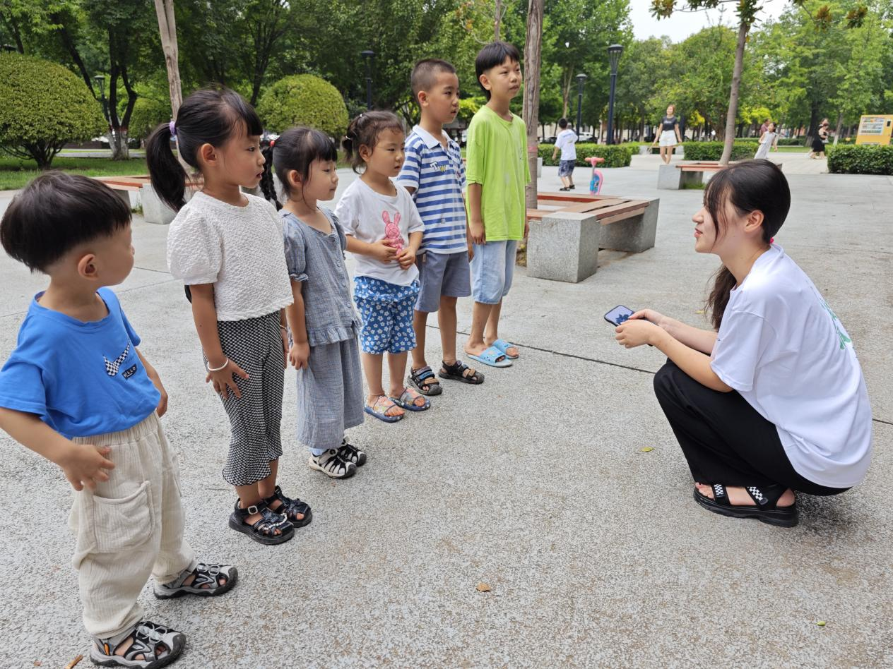 实践队员在张载文化广场教小朋友朗诵《弟子规》 钟应奇摄