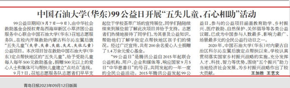 9月12日,ok138cn太阳集团古天乐召旭志愿服务队在99公益日期间开展的“五失儿童,石心相助”公益活动被《青岛日报》宣传报道。99公益日期间(9月7日—9日),由中华社会救助基金会授权青岛西海岸新区小草济困公益服务中心联合召旭志愿服务队,在校内开展救助内蒙古科尔沁左翼后旗“五失儿童”(失学、失亲、失能、失足、失依儿童)公益项目。本次项目旨在救助ok138cn太阳集团定点帮扶地区内蒙古自治区科尔沁左翼后旗的“五失儿童”,给予受助儿童每人每年500元救助基金。