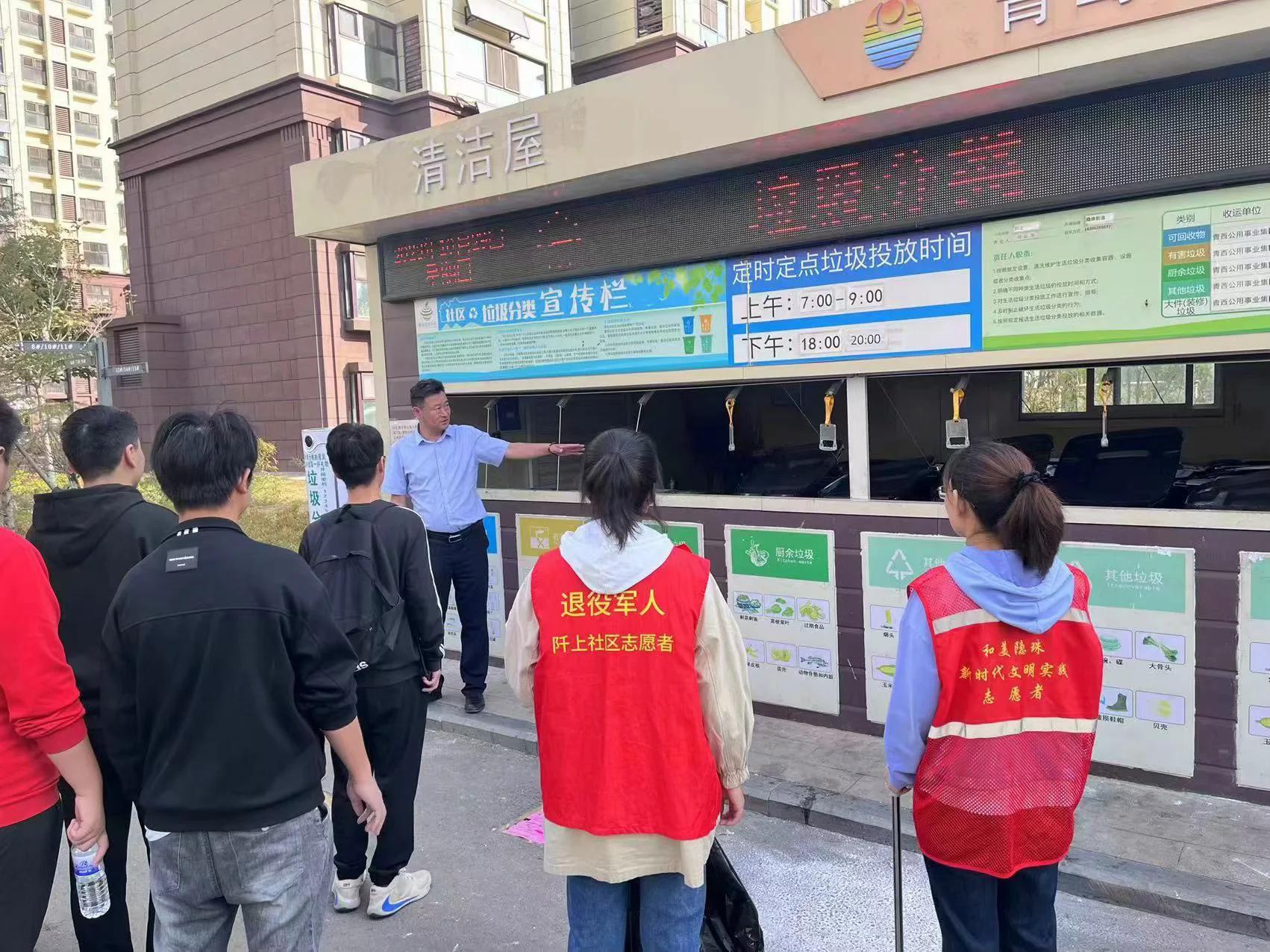 在社区负责人的带领下同学们一路上清理沿路的垃圾,并在垃圾回收处将对应的垃圾丢进相应的垃圾桶中。然后由负责人与团支书分别讲解有关垃圾分类的相关知识,互相探讨,加深了同学们对垃圾分类以及相关知识的理解。