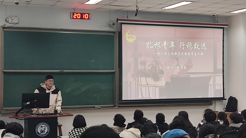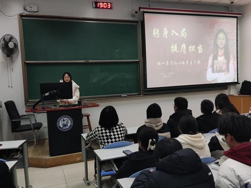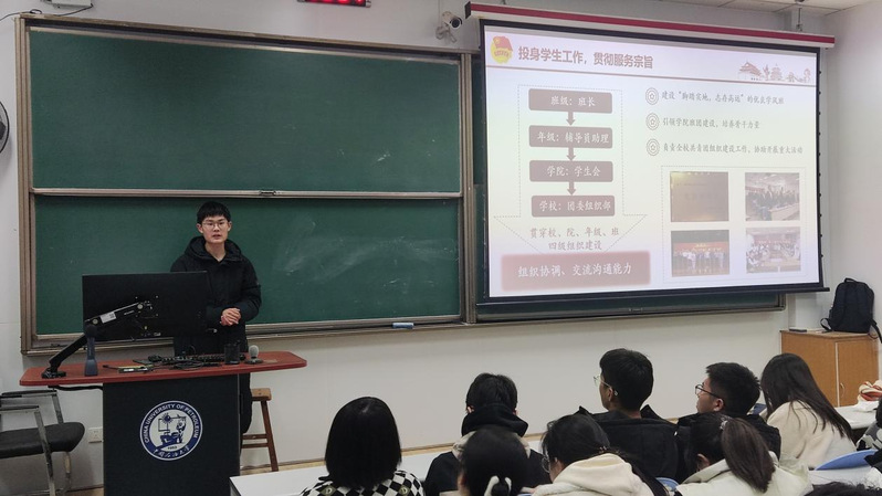 团学干部选修课堂上,来自经济管理学院的刘艺婉从自身学生工作经历的角度辨析学生、干部与学生干部的任务内容。她提出,想要做好一名优秀的学生干部,就要奉行“三心,三力,三性”的工作宗旨,懂得奉献、合作、创新,注意细节。“‘做青年友,不做青年官;多为青年计,少为自己谋’应当是一名学生干部的初心。”刘艺婉如是说。来自文法学院的苏国阳根据自身成长经验指出,大学生应该将兴趣特长与大学生活相联系,结合自身特点展开学生工作,在保证学习的情况下,尽量多去尝试展示自我,不必畏惧失败。来自储运与建筑工程学院的徐瑞辰强调,学生干部要学会自我吃苦,找到一个合适的学生组织,做好时间规划,平衡好学习,用自己的工作思路把工作串联起来,追求并且成为“六边形战士”,打破信息差,提高自信力,收获充实生活。最后,来自海洋与空间信息学院的李凌骁以“求精,克难”为题,强调不论是何岗位,不论身处何种困境,全心全意服务同学,做青年朋友的知心人、青年工作的热心人、青年群众的引路人才是制胜法宝。同时,他鼓励学员们尽早培养学生工作能力,多主动了解信息,多维度发展并提升综合能力——服务能力、思维能力、创新能力,成为学生骨干。
