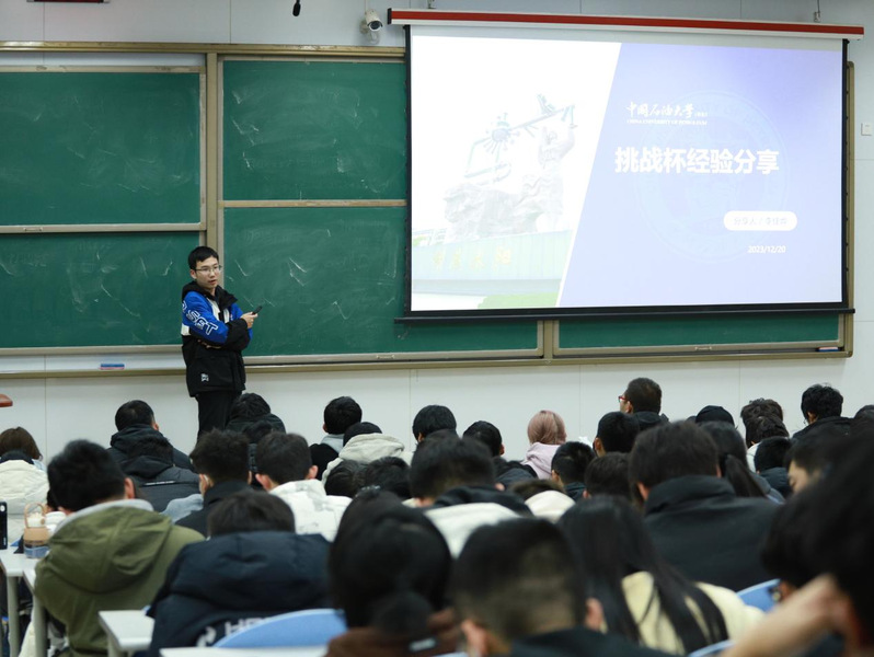 创新实践及文体发展选修课堂上,来自经济管理学院的刘晓雯向大家介绍“三大赛”的具体赛事,并以“中国国际大学生创新大赛”中优秀项目“清废先锋——村镇固废高效处理处置赋能乡村生态振兴”为例,细致地展示了大学生参赛的流程。来自储运与建筑工程学院的木尼拉·木扎帕尔通过讲述她与团队成员在第十八届“挑战杯”全国大学生课外学术科技作品竞赛红色专项活动中所获得的特等奖项目“边疆戎耀——基于七省十二市边防军民的访谈实录”投入的精力和感悟。在谈及该项目实现了我校在该赛道上国家级特等奖零突破的感想时,木尼拉·木扎帕尔说:“理工科学生要走出舒适圈,和优秀的文科同学合作的机会一定要把握住,更有助于全面发展。”来自石大山能新能源学院的安洋和赵亓新则分享了他们在参加“互联网+”的经验。来自化学化工学院的李佳烨强调在期刊上发表论文对于有保研意向的本科生而言是加分项,而“三大赛”则是培养创新精神,锻炼团队合作能力,提高答辩技巧与论文写作水平等的重要平台。