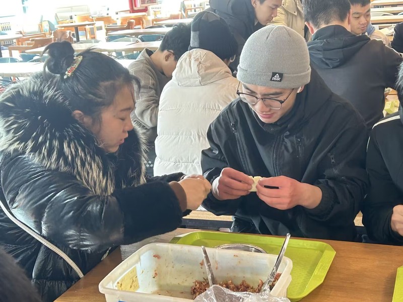 建环2301班班主任刘扬与同学一起包饺子 隋瑞琦摄