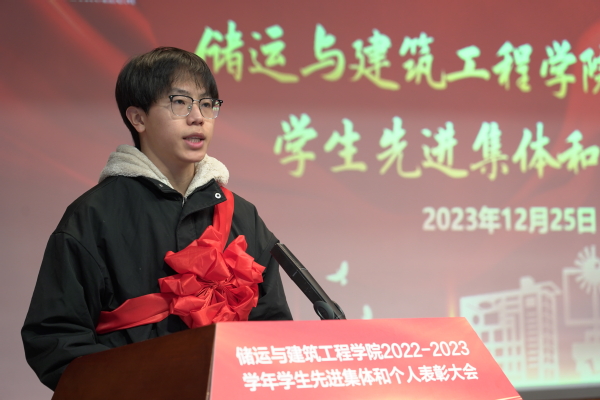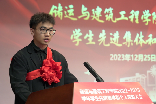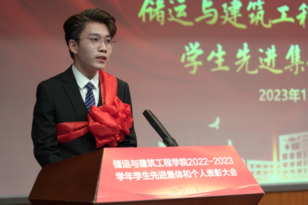 建环2001班陈宇代表“优良学风班”发言,他分享了班级学风建设、组织建设和文化建设等方面的举措和成效,认为个人的成长离不开良好的班级文化氛围,优秀的班级应始终把学习作为第一要务,营造“赶学比超”的学风,在立足学业发展基础上,积极参与第二课堂,全面发展。储运2103班杨文杰在发言中分享了自身学习的感悟,他表示,大学要有明确的目标、坚定的信念和笃实的行动,要有意识地培养勤奋刻苦、不怕困难的品格。建筑2102班王卿临在发言中分享了自己参与第二课堂、提升自身综合素质的心得体会,他认为,第二课堂不仅丰富大学生活,更能提升个人组织协调、沟通表达、策划写作等各方面的能力,帮助个人全面成长成才。土木2004班高亦夫代表毕业生对自己求职的经历和感悟进行分享,他表示,要及早做好职业生涯规划,明晰不同阶段的不同目标任务,发现自身的优势和不足,有针对性地做好求职准备,勇于实践探索。
