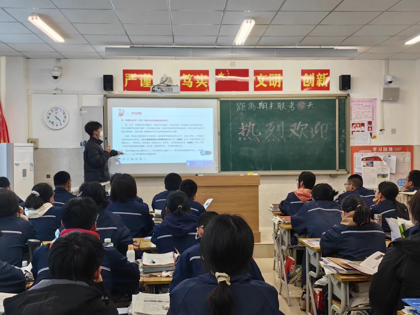 活动前,邢台一中副校长李振生为此次返校宣讲作动员。动员结束后,宣讲队进入高一10班进行宣讲活动。首先,由张春锐通过多媒体形式讲述了学校建校七十年来的发展历史,从各个角度介绍了学校的基本情况,如优势学科和课堂教学方式。随后,任欣雨、刘楚希、孙柏威将宣发册发给同学们,向同学们介绍了学校的招生计划以及学校环境。最后,每位成员向同学们分享了自己精彩的石大生活,以此来激励同学们奋发努力,为了自己的理想大学而前进,同时,刘楚希向大家讲述自己在高中三年积累的学习经验,他的秘诀是“自信”和“努力”。