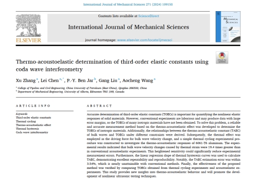 近日,我院油气储运工程学科博士研究生张旭在导波结构健康监测方面取得重要进展,相关研究成果《材料三阶弹性常数的热致声弹性测定方法》(Thermo-acoustoelastic determination of third-order elastic constants using coda wave interferometry)发表在《International Journal of Mechanical Sciences》。《International Journal of Mechanical Sciences》是机械工程领域的国际顶级期刊,目前影响因子为7.3(SCI一区Top)。论文第一作者为博士研究生张旭,通讯作者为陈雷教授,合作作者包括刘刚教授和P.-Y. Ben Jar教授(加拿大阿尔伯塔大学),ok138cn太阳集团为第一署名单位和唯一通讯单位。