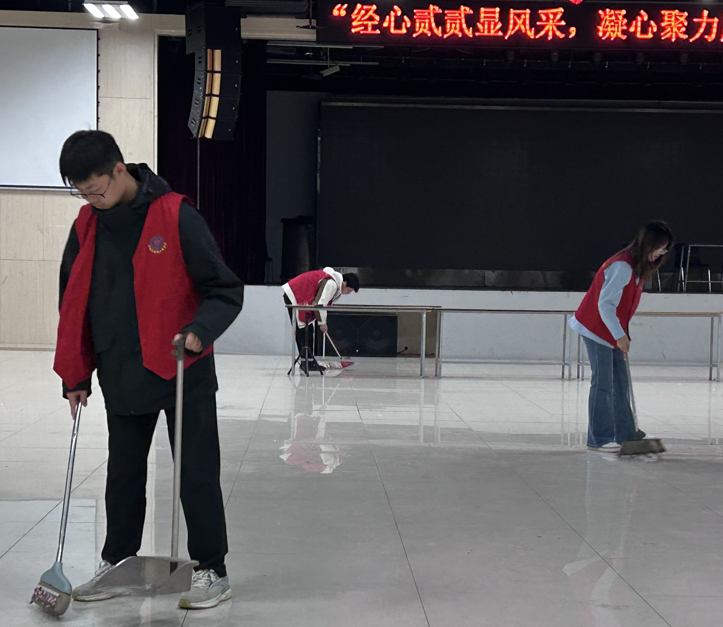 队员们手持清洁工具,以饱满的热情和严谨的态度,对大厅的每一个角落进行了细致的清扫。他们有的低头扫地,有的认真拖地,有的整理椅子,有的清理垃圾,每个人都在自己的任务中勤勤恳恳,共同为大厅的焕然一新贡献着力量。经过半个多小时的辛勤劳动,唐岛湾演艺大厅整洁如新。这不仅是一次简单的卫生打扫志愿服务工作,更是召旭团队精神的集中体现,是对校园环境的热爱与呵护。