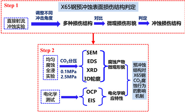 该研究针对于先颗粒冲蚀后CO2腐蚀的特殊工况,讨论了5°、30°和90°三个不同冲角以及0.1 MPa、2.5MPa两个CO2分压对X65管线钢CO2腐蚀行为的影响机制,结合SEM、EDS、XRD和3D轮廓扫描技术从宏观和微观角度表征了预冲蚀表面腐蚀产物膜的形貌特征。该研究填补了预冲蚀结构表面CO2腐蚀行为研究的空白,对天然气集输管道的设计、腐蚀防护和完整性管理工作提供了借鉴和指导。