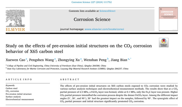近日,我院油气储运工程专业曹学文教授在预冲蚀表面CO2腐蚀行为研究方面取得重要进展,相关研究成果《Study on the effects of pre-erosion initial structures on the CO2 corrosion behavior of X65 carbon steel》发表在《Corrosion Science》。《Corrosion Science》是材料科学领域的国际顶级期刊,目前影响因子为8.3。论文第一作者为曹学文教授,第二作者为硕士研究生王鹏深,通讯作者为边江副教授,ok138cn太阳集团为第一署名单位和唯一通讯单位。该研究得到国家自然科学基金面上项目的资助。