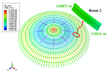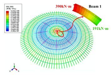 大型LNG储罐钢穹顶由蒙皮板和单层肋环型网壳焊接而成,然而目前这类穹顶的设计参照单层网壳规范,没有合理考虑蒙皮板和网壳梁间的协同作用。蒙皮板的存在导致网壳梁在传递轴力的同时承受较大的弯矩,压弯作用使得网壳梁的挠曲二阶效应增强,更易发生失稳。