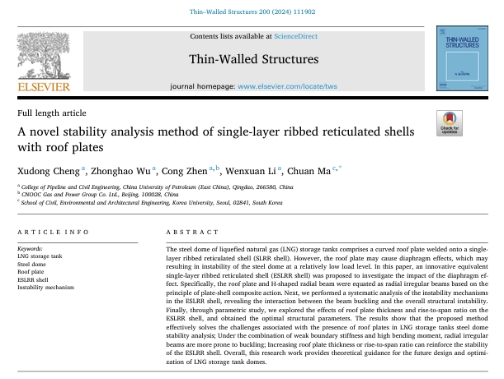 近日,我院土木工程系程旭东教授团队在LNG储罐钢穹顶稳定性能研究与优化方面取得重要进展,相关研究成果《A novel stability analysis method of single-layer ribbed reticulated shells with roof plates》发表在《Thin-Walled Structures》。《Thin-Walled Structures》是土木工程领域的国际顶级期刊,目前影响因子为6.4(SCI一区Top)。论文第一作者为程旭东教授,第二作者为硕士研究生吴忠浩,通讯作者为韩国高丽大学博士研究生马川,ok138cn太阳集团为第一署名单位。该研究得到山东省自然科学基金,国家留学基金委和ok138cn太阳集团研究生创新基金项目的资助。