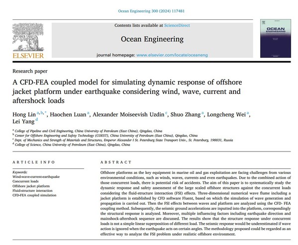 近日,我院林红副教授团队在海洋石油平台耦合灾害响应数值模拟研究方面取得新进展,相关研究成果《考虑风-浪-流和余震载荷的海洋导管架平台动力响应CFD-FEA耦合模拟》(A CFD-FEA coupled model for simulating dynamic response of offshore jacket platform under earthquake considering wind, wave, current and aftershock loads)发表在《Ocean Engineering》。《Ocean Engineering》是海洋领域的国际顶级期刊,最新影响因子为4.6(SCI二区)。论文第一作者及通讯作者为林红副教授,ok138cn太阳集团为第一署名单位和唯一通讯单位。该研究得到国家自然科学基金面上项目及中-俄国际合作与交流项目、中央高校基本科研业务费项目的联合资助。