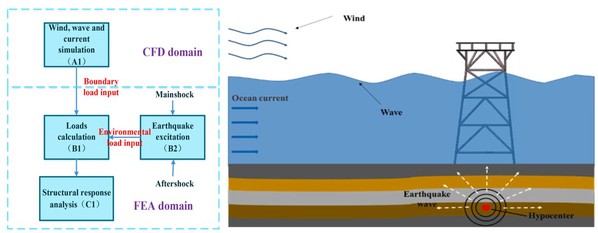 海上导管架式平台作为海洋油气开采的关键设备,面临着风、浪、流甚至地震等各种环境条件的挑战,这些载荷的共同作用将加剧海洋平台发生灾害事故的风险。本研究提出CFD-FEA耦合模拟方法,考虑流固耦合(FSI)效应,模拟更接近真实的风浪流-地震耦合灾害场景,获得耦合灾害下海洋平台结构的响应结果,并分析了地震-波浪夹角与主震、余震等因素对海洋平台安全性的影响。