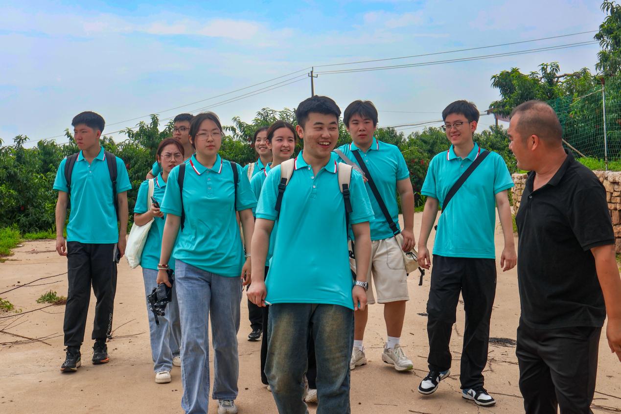 上午,实践队成员来到肥城桃科普教育基地(新农发肥桃有机种植合作社),跟随果农脚步,亲身体验摘桃,了解肥城桃的种植与采摘过程。果农们为实践队成员们亲自示范,耐心讲解着每一个环节的要点和技巧,分享了判断桃子的成熟度和根据大小、色泽、外观有无瑕疵等标准筛选的方法,确保每一个进入市场的桃子都品质优良。实践队成员在采桃过程中仔细甄别,认真挑选。
