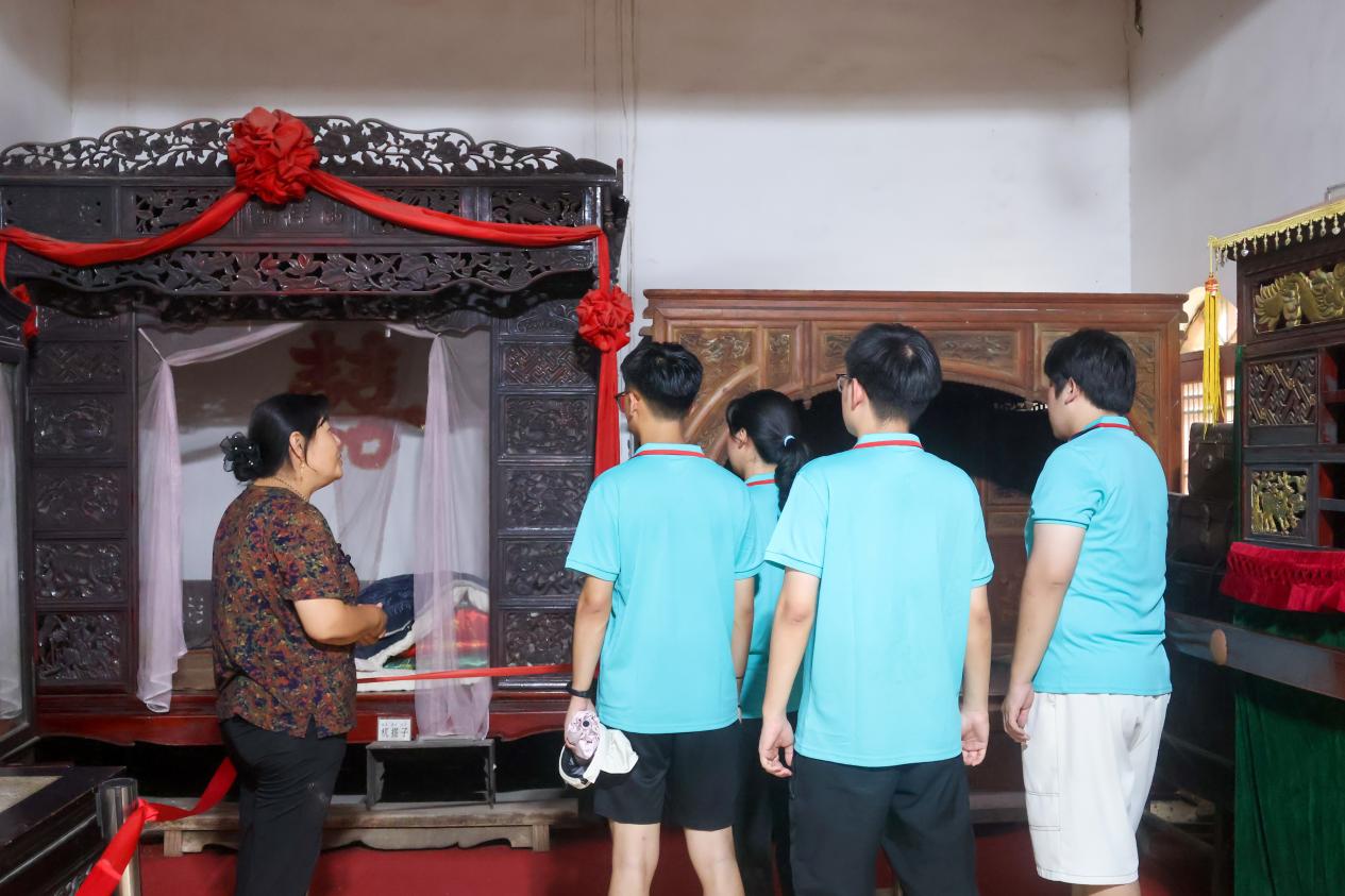 上午,实践队成员参观马家埠民俗博物馆,该馆是以元末明初具有600多年历史的古建筑“丁家庙”为主扩建而成,辅以青砖灰瓦,红门斗彩,以其古朴不失典雅、安静不失雄伟的气质记录着这片土地的发展,吸引游客参观。在讲解员的带领下,实践队成员在馆中了解马家埠的民俗历史变迁和时代进步。实践队成员在室外体验区逐步体验了石磨、石碾、水车等各种生产工具,感受本土人文风情。随后,实践队成员参观了解放前夕老百姓使用的木质各种生活器具和锯、刨、锛、凿等木工工具;太平车、马车、木轮车和锄镰鐝掀等农用工具;织布机、纺线机、服装鞋帽、刺绣等加工工艺道具。