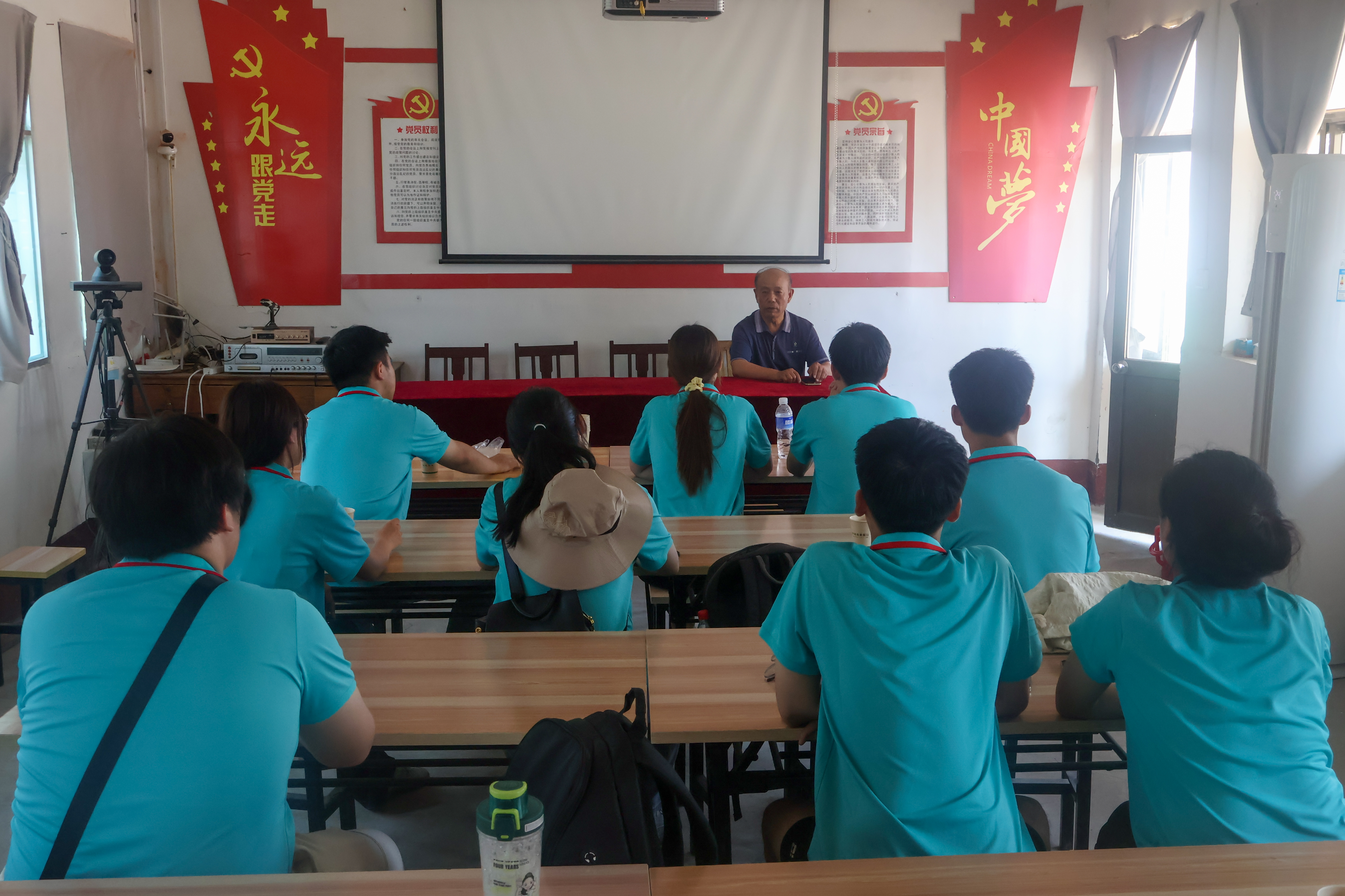 随后,实践队来到朱家颜子村,与村党支部书记杜均涛进行交流座谈。杜均涛提到,朱家颜子村积极引进国内先进的播种、收割、灌溉设备,借助智能终端检测来播种和收割,提高了种子的出苗率、质量以及产量,使村集体的经济收入大幅提升,引入科技兴农、现代化强农的思路,将“一块田”政策现代化、科技化。同时,为充分发挥设备资源的最大效益,朱家颜子村还将设备进行对外租赁,提高设备利用率和村集体的经济效益,开创了多村协同发展、共同富裕的良好局面。最后,杜均涛带领实践队参观先进的“免耕施肥播种机”和“水肥一体化智能灌溉设备”,并简单介绍它们的工作原理、优势和特点,让实践队成员对“一块田”的现代化农业有了更直观、深刻的认识。