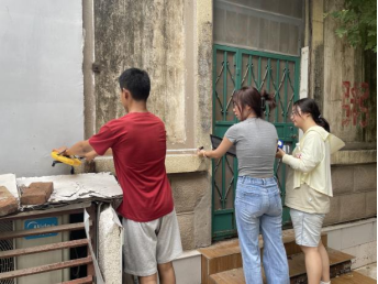 “建筑筑梦实践队”通过系统的实地踏勘、精细的现场测绘,结合专业知识,全面调查老旧街区的更新改造现状。实践队借助高精度测距仪、无人机航拍系统等先进测量工具,对选定区域的老旧建筑的结构及环境进行了全方位记录。实践队员手持高精度测距仪,深入建筑内部进行了精确测量,记录下的数据将为后续的翻新改造设计提供重要参考。