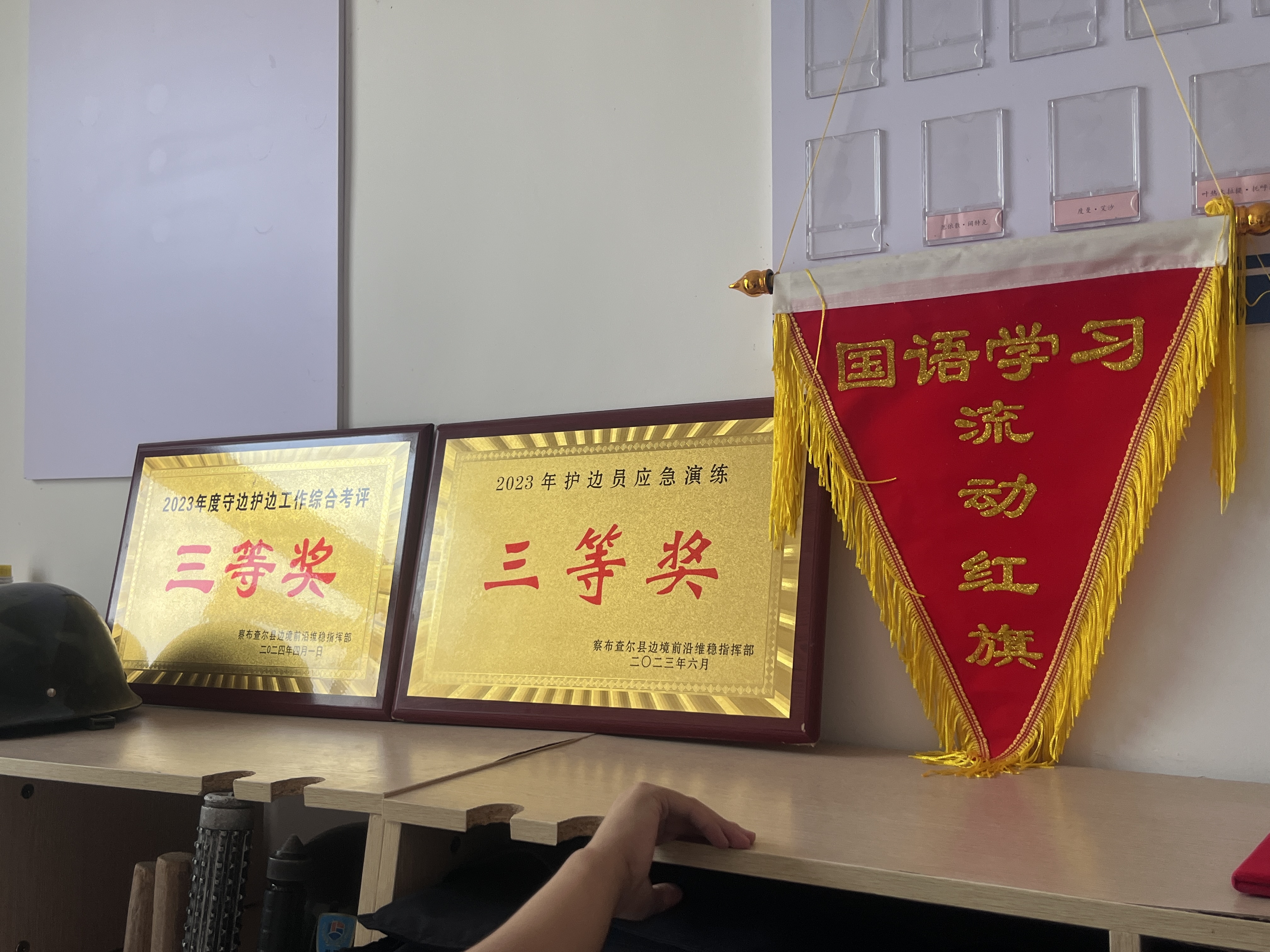 下午,实践队来到了察布查尔先都拉塔5号护边员执勤房。执勤房的墙上挂满了边防战士们获得的各种奖牌和荣誉,比如“庆祝建党100周年红歌比赛一等奖”等,实践队员在此了解到许多成边英雄的事迹,学习到了戍边卫国的红色爱国精神。