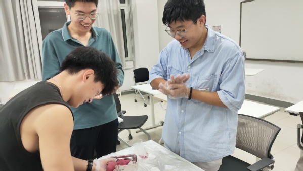 活动伊始,同学们怀着兴奋与期待的心情齐聚一堂,跃跃欲试。团支部书记傅润桐首先为大家详细讲解了月饼制作的历史渊源,从古代月饼作为祭品到如今成为阖家团圆的象征,加深了同学们对月饼文化内涵的理解。傅润桐逐步示范制作月饼的过程,从揉面团的技巧、包馅料的手法到模具按压成型的力度和角度。同学们开始亲自动手实践,取面皮,包馅料,用模具一压,一个象征着团圆意义的月饼跃然掌心。实践期间,支部成员相互交流、相互帮助,脸上洋溢着喜悦与自豪的笑容。