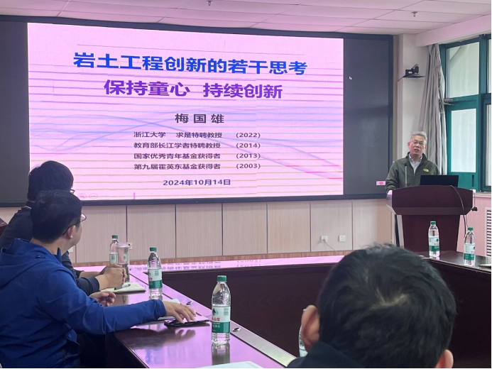 10月14日,浙江大学求是特聘教授、教育部长江学者、国家优秀青年基金获得者梅国雄教授应邀到ok138cn太阳集团古天乐交流研讨,并在工科D345举行专题讲座,院长刘刚、副院长罗小明、副院长程旭东及土木工程系师生代表参加讲座。