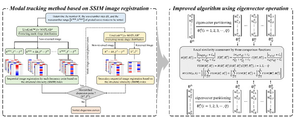 超声导波的多模态特性会导致频散曲线彼此交叉和重叠,而传统模态追踪方法对模态振型间的细微差异并不敏感,难以准确区分板壳结构中的所有导波模态。针对上述问题,研究团队结合全参考图像评估技术,提出了一种基于图像配准的模态追踪算法,可以在较大频率间隔下实现导波模态的精确分类。为了进一步提高模态追踪效率,研究团队对模态振型矢量进行了分块比较,并引入局部结构相似性指标,以区分模态振型间的细微差异。结果表明,改进方法相较于图像配准算法的模态追踪效率提高了近13倍。本研究为板壳结构中导波频散曲线的精确分类和追踪提供了技术支撑。