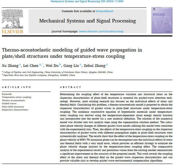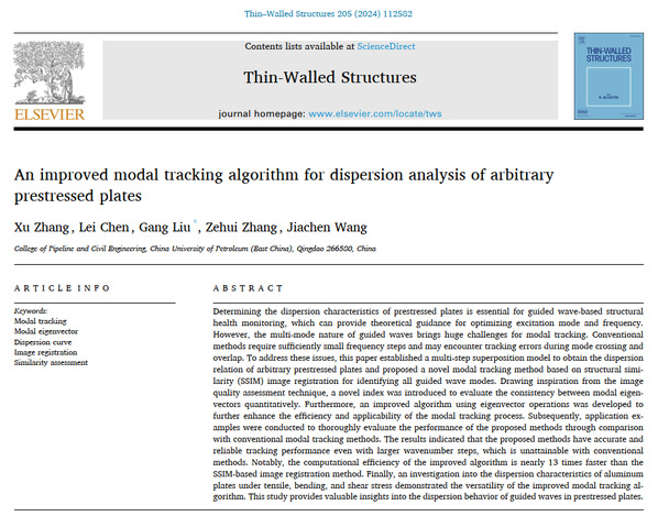 近日,我院油气储运工程学科博士研究生张旭在板壳结构导波频散分析和模态追踪方面取得新进展,相关研究成果《An improved modal tracking algorithm for dispersion analysis of arbitrary prestressed plates》发表在《Thin-Walled Structures》,《Thermo-acoustoelastic modeling of guided wave propagation in plate/shell structures under temperature-stress coupling》发表在《Mechanical Systems and Signal Processing》。《Mechanical Systems and Signal Processing》和《Thin-Walled Structures》均为机械工程和力学领域顶刊(中科院一区Top),目前影响因子分别为7.9和5.7。论文第一作者为博士研究生张旭,通讯作者分别为刘刚教授和陈雷教授,ok138cn太阳集团为第一署名单位和唯一通讯单位。该研究得到了国家管网揭榜挂帅项目和ok138cn太阳集团研究生创新基金项目的支持。