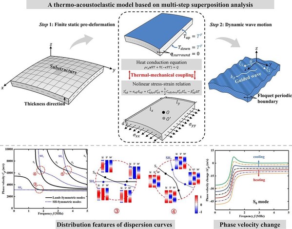 超声导波作为一种受结构边界约束和引导的机械弹性波,具有覆盖范围广,损伤灵敏度高等优点,被广泛应用于板壳结构的无损检测和结构健康监测。然而,服役环境中的温度变化与结构应力会影响导波传播速度,导致损伤信息的误报和漏报,极大限制了导波检测技术的可靠性和准确性。针对上述问题,研究团队构建了具有温度依赖性的超弹性本构方程,提出了板壳结构的热声弹性频散分析模型,采用多分析步叠加求解,探究了不同温度-应力耦合作用下导波相速度和波结构的变化规律。结果表明,在均匀温度变化下,导波传播平面内的不均匀应力状态会改变Lamb波和SH导波的位移波结构分布,导致两者的频散曲线在原本交叉点处彼此排斥并偏离。此外,导波模态的相速度变化与温度-应力耦合条件、频率和传播方向密切相关。本研究揭示了环境温度变化和结构应力耦合作用对板壳结构频散特性的影响,为开发导波环境补偿算法提供了数据支撑。