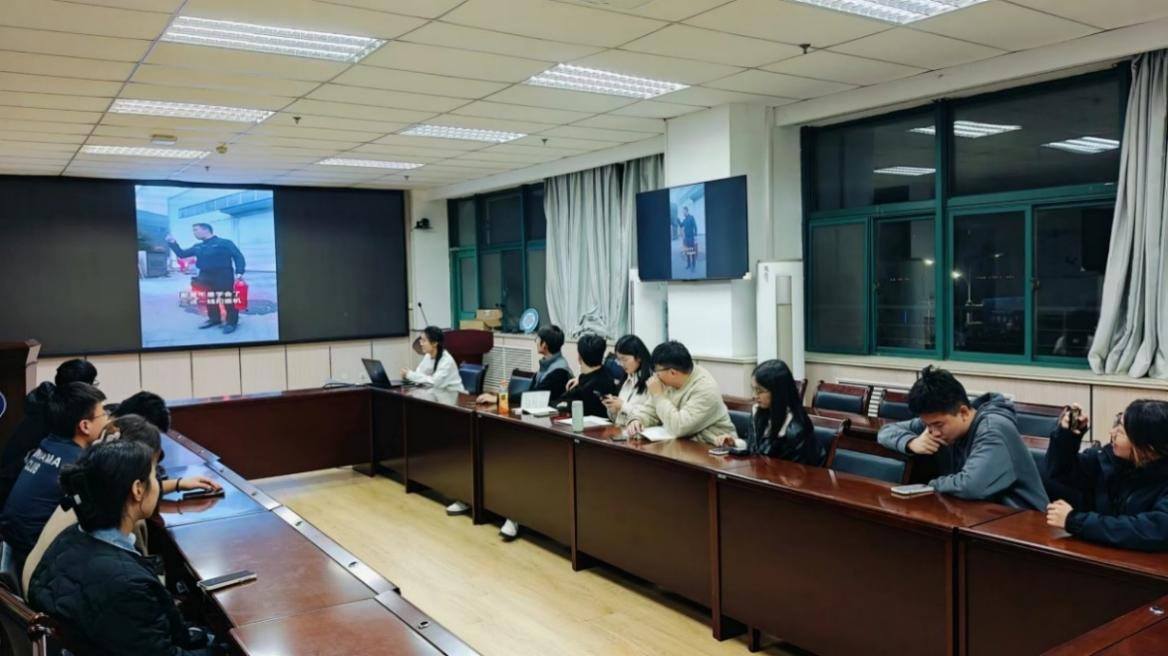 随后,团支部书记播放了一段关于消防设备使用的教学视频。视频详细演示了灭火器的正确操作步骤,包括拔出保险销、握住喷管到保持安全距离灭火等,同时提醒大家注意风向以免浓烟反扑。视频还重点介绍了如何使用消防栓进行快速灭火,包括连接水带、打开水阀等规范步骤。此外,消防面罩的使用也通过真实场景还原进行了展示,强调在浓烟环境中如何正确佩戴面罩。