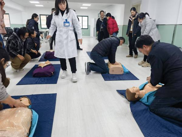 本次培训的内容包括急救基础理论知识、心肺复苏(CPR)技能、自动体外除颤仪(AED)使用方法、海姆立克急救法等,培训采取理论讲解与实操演练相结合的方式。郭娅棣医生通过生动的案例分析和理论讲解,帮助参训教职工对急救知识有了初步认识,随后,在医生的指导下,每位参训教职工动手操作。活动最后还组织了现场考核,参与者在模拟急救的场景中灵活运用所学技能进行实操,主讲医生逐一进行检查和点评。这一环节不仅检验了学习成果,更激发了参与者深入学习的热情。