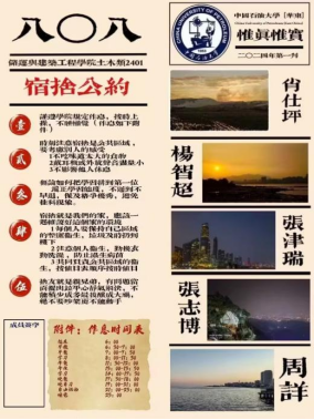 在“寓”你相约,公约共创绘蓝图——宿舍公约设计活动中,各宿舍成员积极参与,共同商讨制定出具有创意且符合宿舍特色的文明公约。从学习、生活、卫生到作息、人际交往等多维度出发,涵盖了设立卫生值日制度、制定合理作息时间表、营造学习氛围、限制游戏娱乐时间、垃圾随手下楼以及建立矛盾解决机制等具体可行的条款。很多宿舍发挥创意,设计独特的室名、室训,以书面、海报等多种形式展现公约,彰显了宿舍的个性与风采。此活动不仅规范了宿舍生活秩序,融合宿舍关系提供了机会。在公约制定过程中,宿舍成员们敞开心扉,深入交流彼此的生活习惯与期望,一些潜在的矛盾与误解得以提前化解。