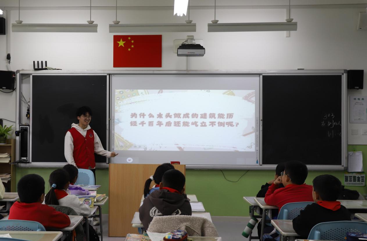 3月14日,昆仑山路小学的303教室内充盈着木构件的碰撞声与16名学生的惊叹,召旭志愿服务队以“榫卯之始”为主题,通过理论讲解与实践体验,带领学生揭开中国传统建筑技艺的千年奥秘。