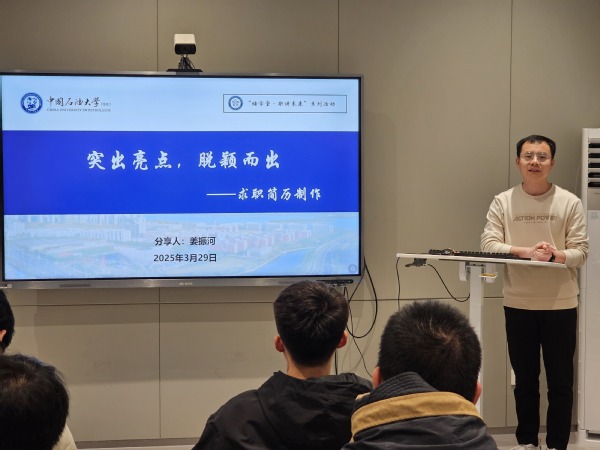 为给同学们提供更具精准度和实用性的升学和就业指导,助力帮助高年级学生提前了解就业市场的形式和政策,3月29日下午,储建学院学生会在大学生活动中心二楼演播室举办“储学堂·职讲未来”系列活动第一期。本次活动邀请研究生姜振河作求职经验分享和升学问题指导,40余位学生代表参加本次活动。